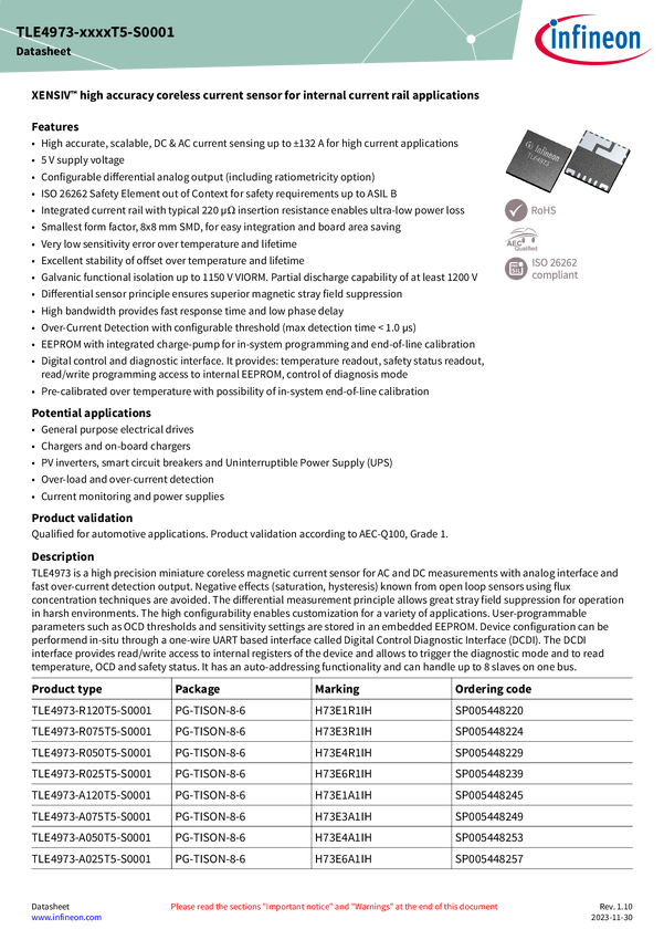 XENSIV™ - TLE4973-R120T5-S0001 high accuracy coreless current sensor with digital control and diagnostic interface in TISON package The Infineon XENSIV™ TLE4973-R120T5-S0001 is a current sensor with integrated current rail in 8x 8 mm SMD body which enables optical inspection in the assembly line. This sensor works at 5 V with up to ±132 A measurement range and provides an analog output with over current detection output. Digital control interface provides temperature readout, safety status readout, read/wr