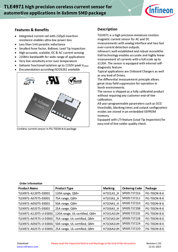 XENSIV™ - TLE4971-A120T5-U-E0001 high precision coreless current sensor, analog interface, optical inspection capable small SMD package, UL certified The Infineon current sensor TLE4971-A120T5-U-E0001 is an automotive qualified pre-programmed 120 A sensor. It serves the unique ±120 A measurement rage, the highest for current sensors with integrated current rail in a small SMD body and introduces a new package developed to enable optical inspection in the assembly line. Due to the coreless magnetic current
