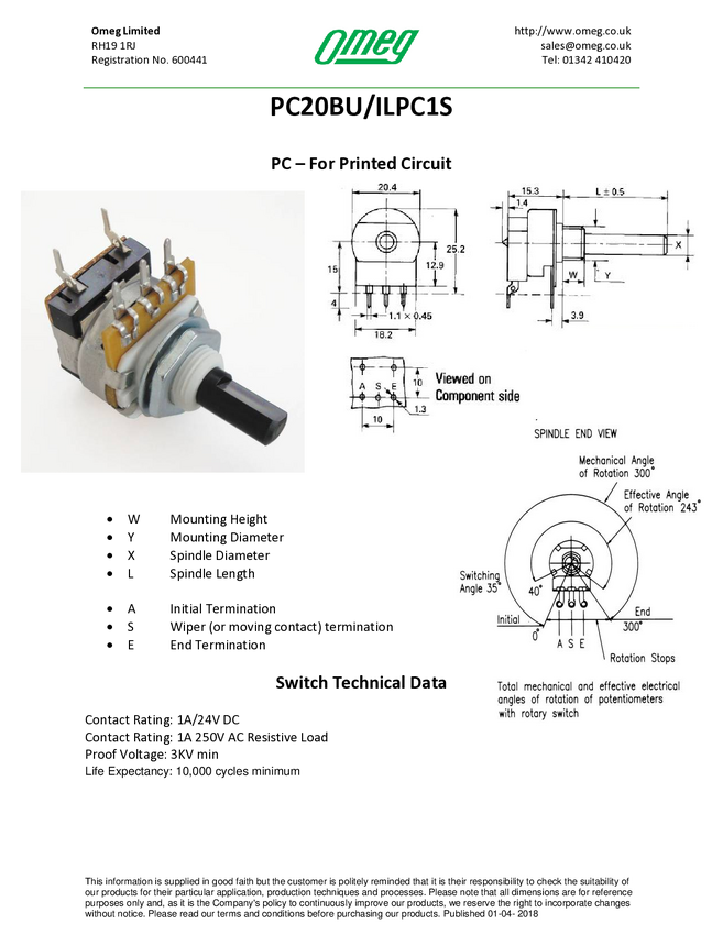 PS Omeg PC20BU/PC1S CEPS F1 A100K PC20BU/PC1S CEPS F1 A100K Potencjometr obrotowy z przełącznikiem mono 100 kΩ 1 szt.