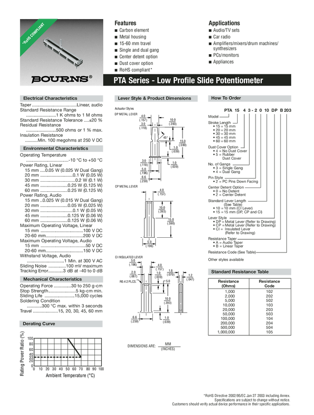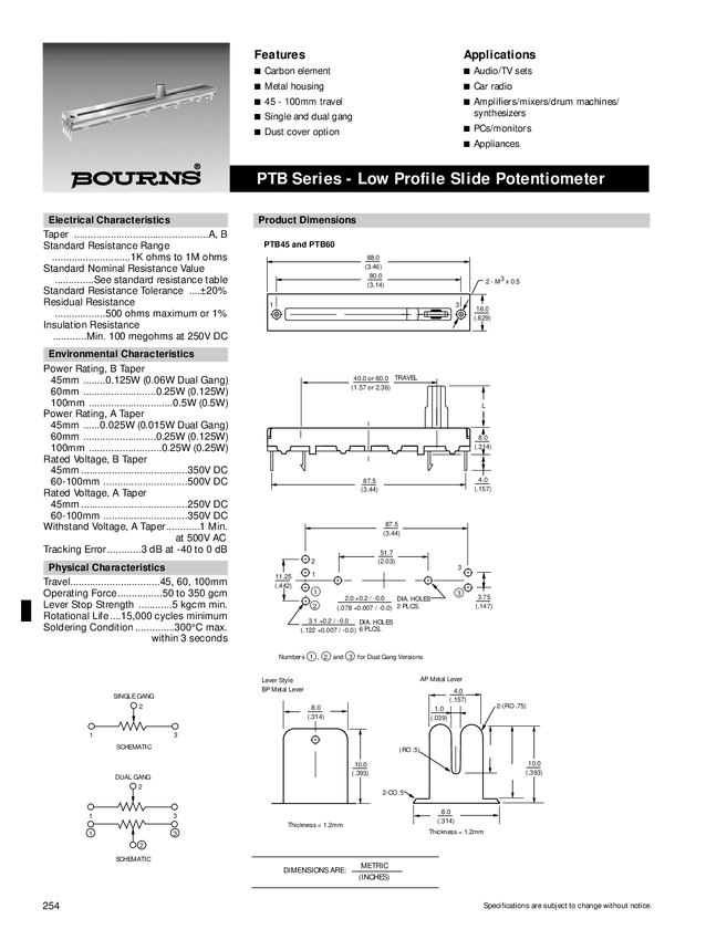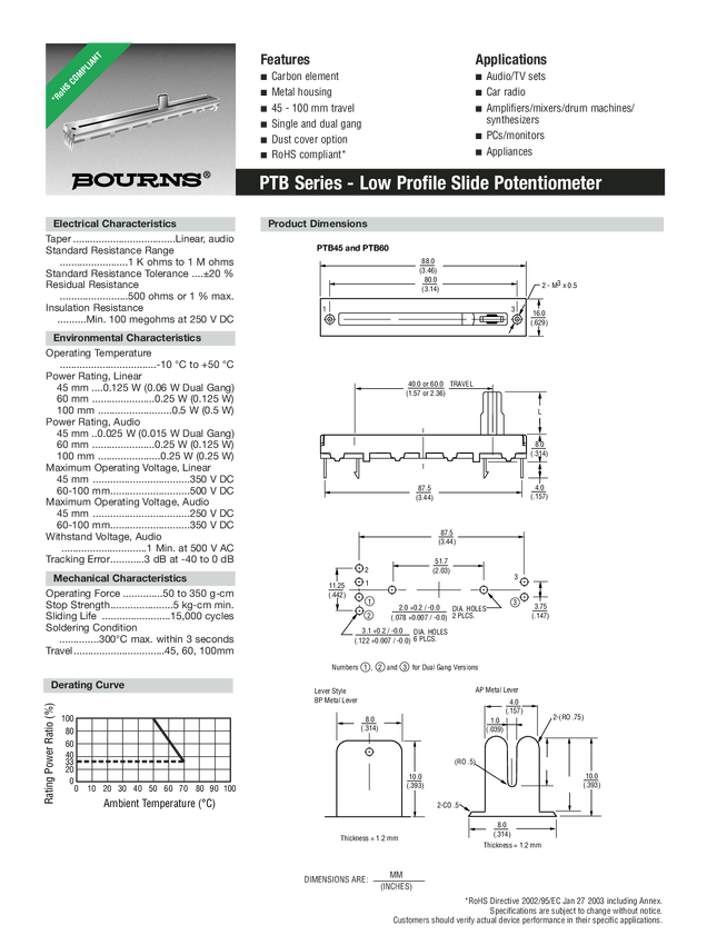 Potencjometr suwakowy węglowy mono travel 45mm wym:60x9x6,5mm; śr.56mm; otwory: 58,5/50,2/47,8mm moc 0,25W/0,125W tol.20%; charakterystyka liniowa 10kohm wodzik metalowy 4x1.2x15mm; patrz PMPTA4553-2015CPB103