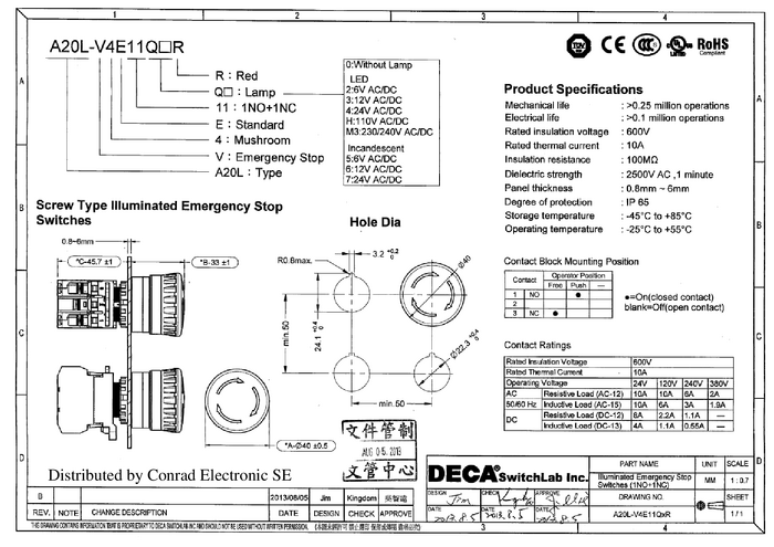 DECA 1233817 Wyłącznik awaryjny A20L-V4E11Q5R, 240 V/AC, 1 NO, 1 NC, 1 szt.