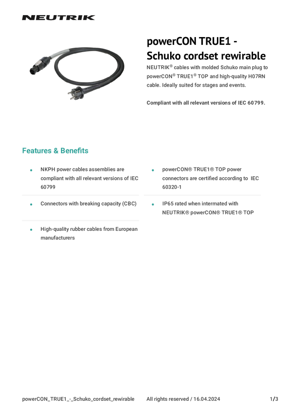 kabel Neutrik NKPH02-A2MF-M0150 1027578, H07RN-F 3X 2,5 mm², 1.50 m