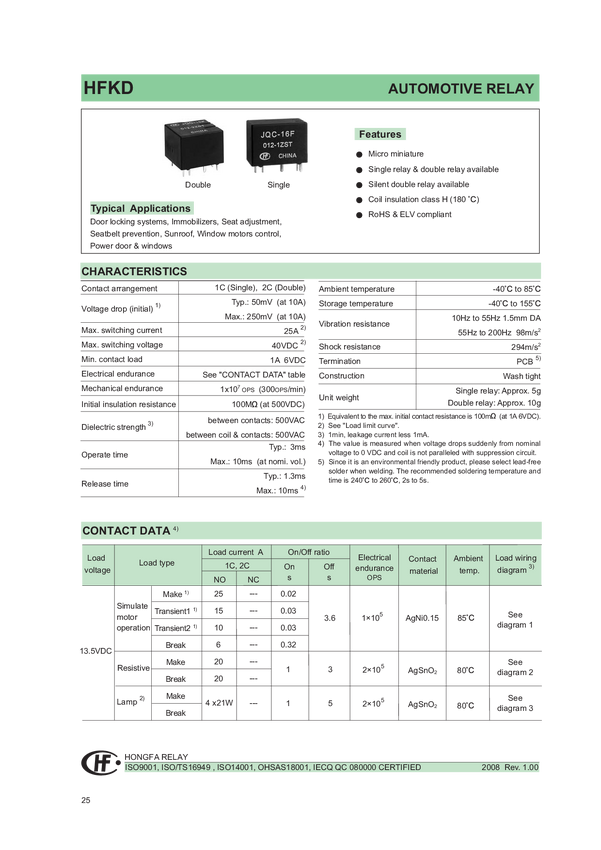 Przekaźnik; elektromagnetyczny samochodowy; HFKD-012-2ZST; 12V; DC; 2 styki przełączne DPDT; 25A; 40V DC; na PCB; 0,56W; HONGFA; = V23084-C2001-A303; RoHS