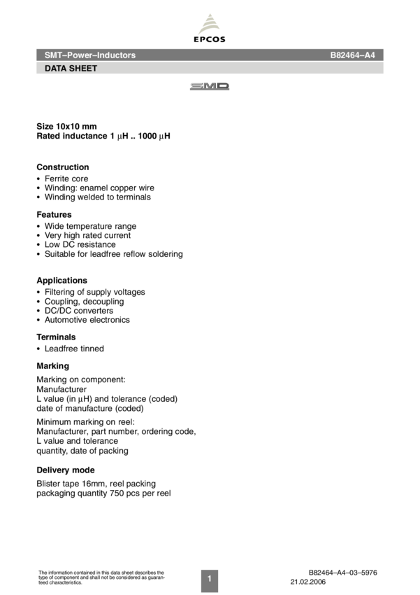 Ind Power Wirewound 10uH 20% 100KHz Ferrite 1.15A Blister T/R