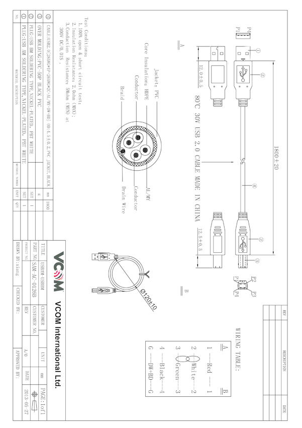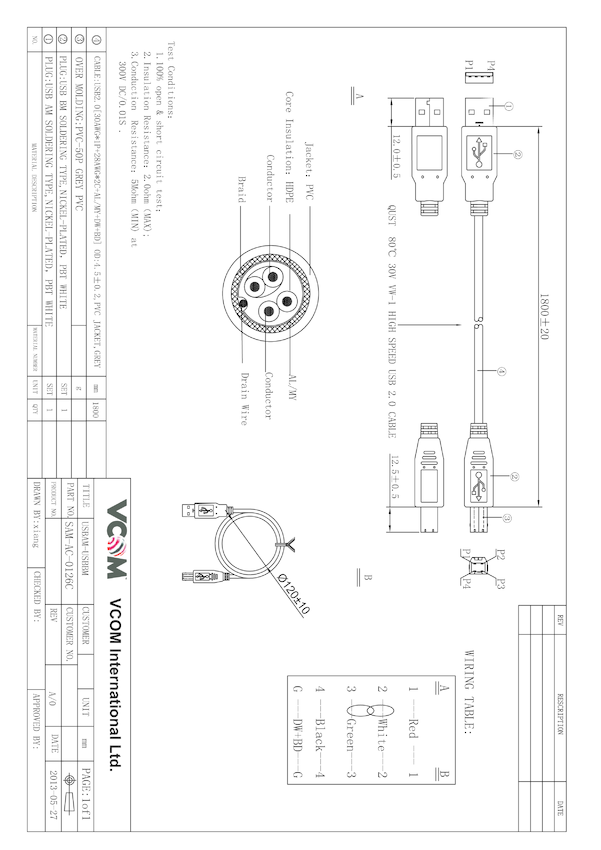 Kabel USB standardu USB2.0, zakończony wtykami: A4 męski B4 męski, 28AWG + 30AWG , biały, 1.8mtr