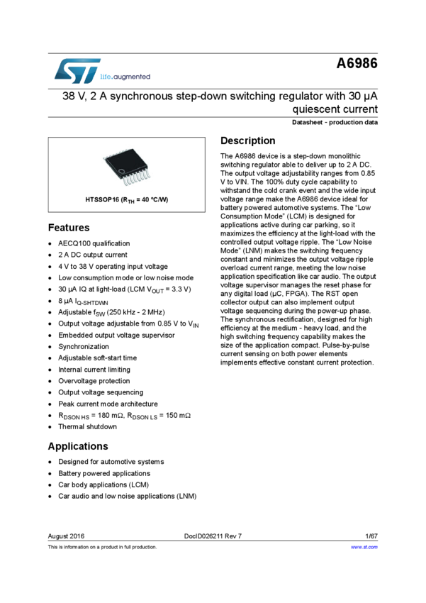 38 V - 2 A synchronous step-down switching regulator evaluation board based on the A6986
