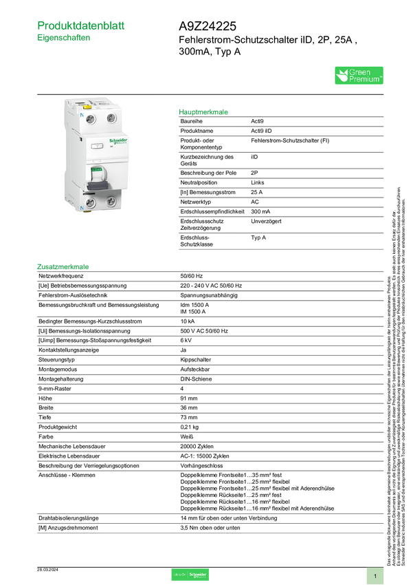 Wyłącznik różnicowoprądowy Schneider Electric A9Z24225, 25 A, 0.3 A