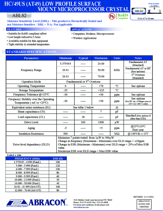 CRYSTAL, SMD, uP, Low Profile, HC/49US (AT49), 15.000MHz, T&R