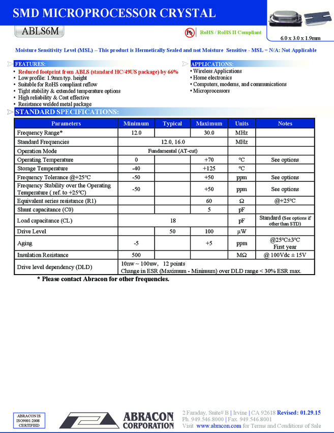 CRYSTAL, SMD, uP, Low Profile, HC/49US (AT49), 6.000MHz, T&R