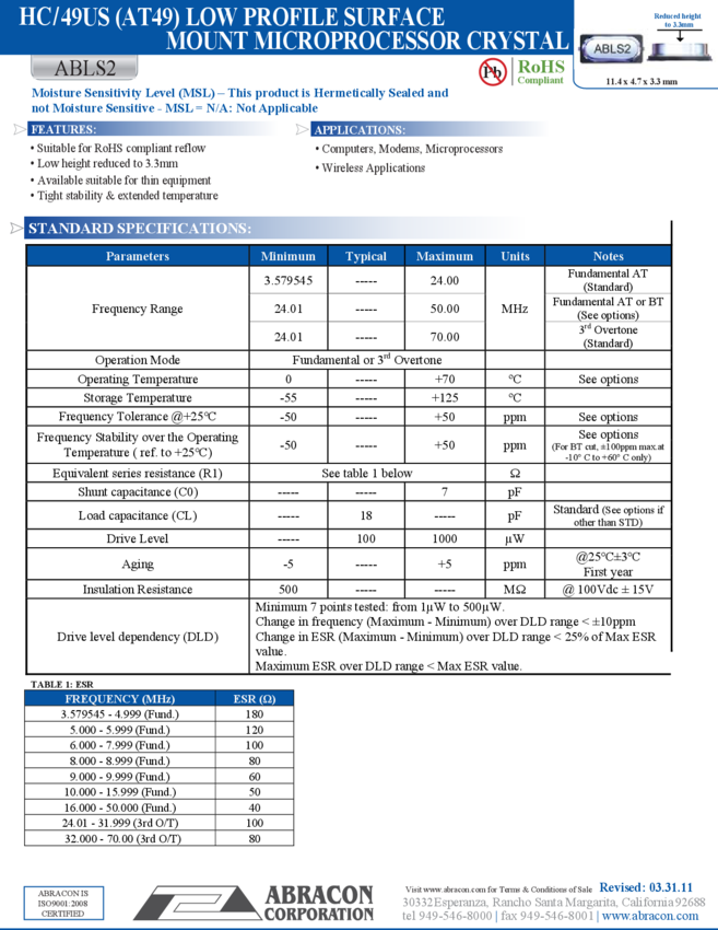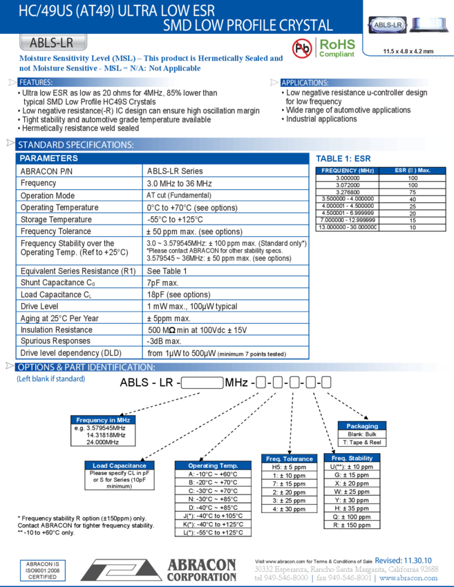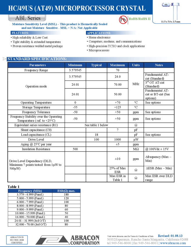 CRYSTAL, SMD, uP, Low Profile, HC49/US (AT49), 3.6864MHz, T&R