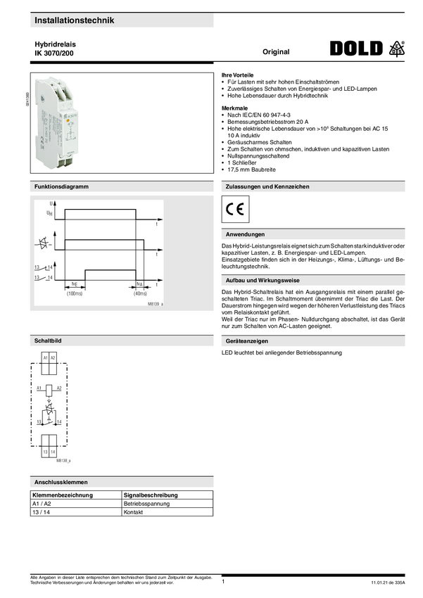Dold IK3070.01/200 AC50/60Hz 220-240V Hybridleistungrelais Przekaźnik Napięcie znamionowe: 240 V/AC Maksymalne natężenie