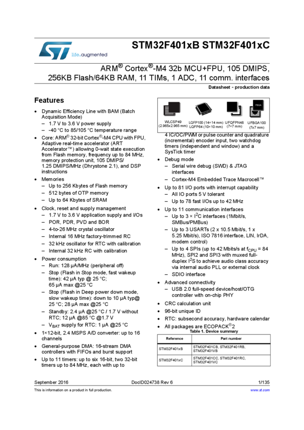 STM32 Dynamic Efficiency MCU, ARM Cortex-M4 core with DSP and FPU, up to 256 Kbytes Flash, 84 MHz CPU, Art Accelerator