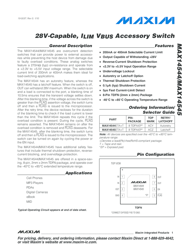 MAX14545 28V Capable Current-Limit VBUS Accessory Switch