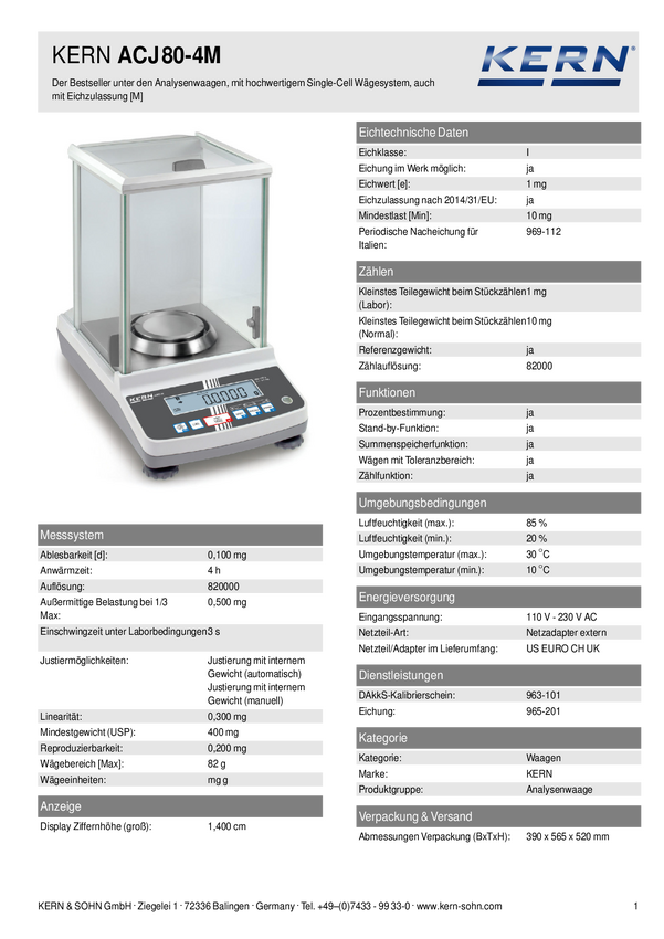 Waga analityczna Kern ACJ 80-4M, Zakres pomiaru maks.: 82 g, Podziałka: 0.0001 g