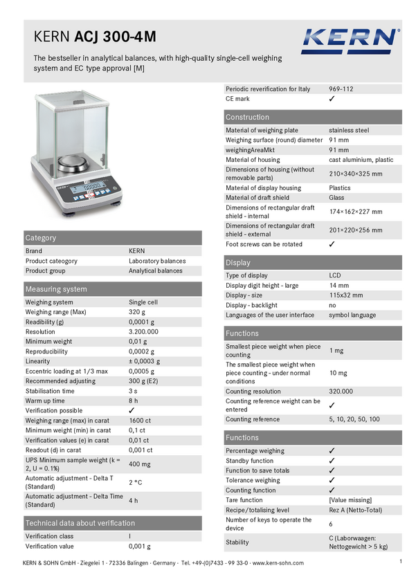 Waga analityczna Kern ACJ 300-4M, Zakres pomiaru maks.: 320 g, Podziałka: 0.0001 g