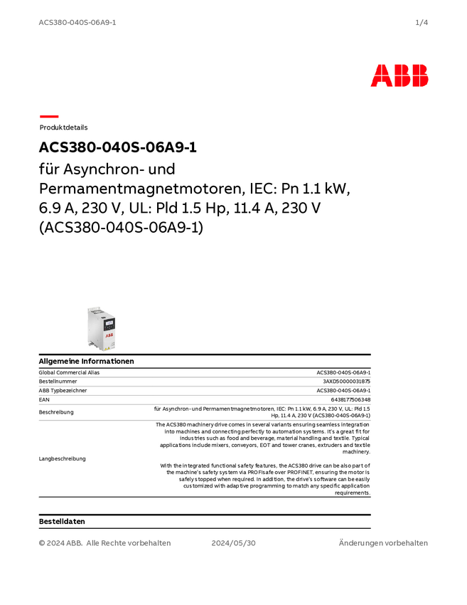 Przemiennik częstotliwości ABB ACS380-042S-06A9-1 1.1 kW 240 V