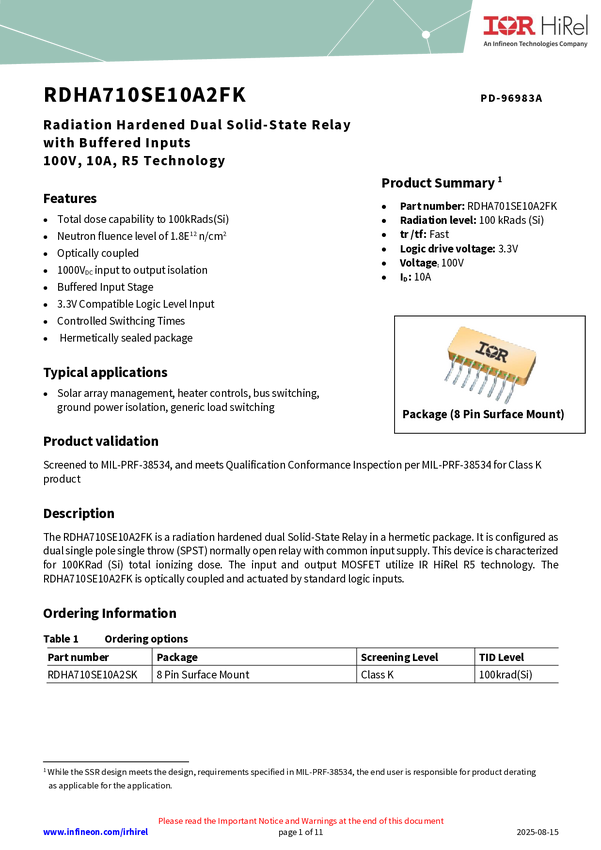 The RDHA710SE10A2FP is a 100V 10A rad hard solid state relay with a dual pole, single throw normally open configuration in a 8-pin surface mount package. It is characterized for 100kRad(Si) TID and features fast response times.The device is optically coupled and actuated by standard logic inputs. It is the unscreened version of RDHA710SE10A2FK.