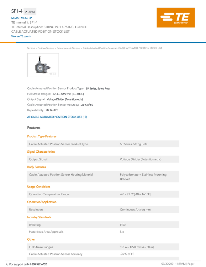 TE Connectivity TE TCS Cable Actuated (String Pots) SP1-4