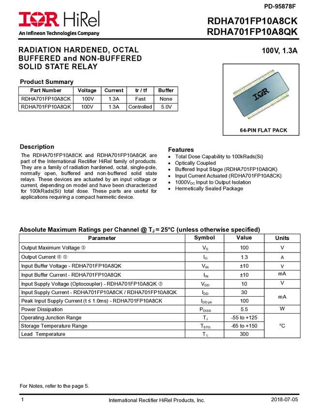 IR HiRel's RDHA701FP10A8QP is a 100V 1.3A rad hard solid state relay with an octal pole, single throw normally open configuration in a 64-pin flatpack package. It is characterized for 100kRad(Si) TID and can be actuated by an input voltage or current (depending on the model). These compact and hermetic relays are ideal for various applications.