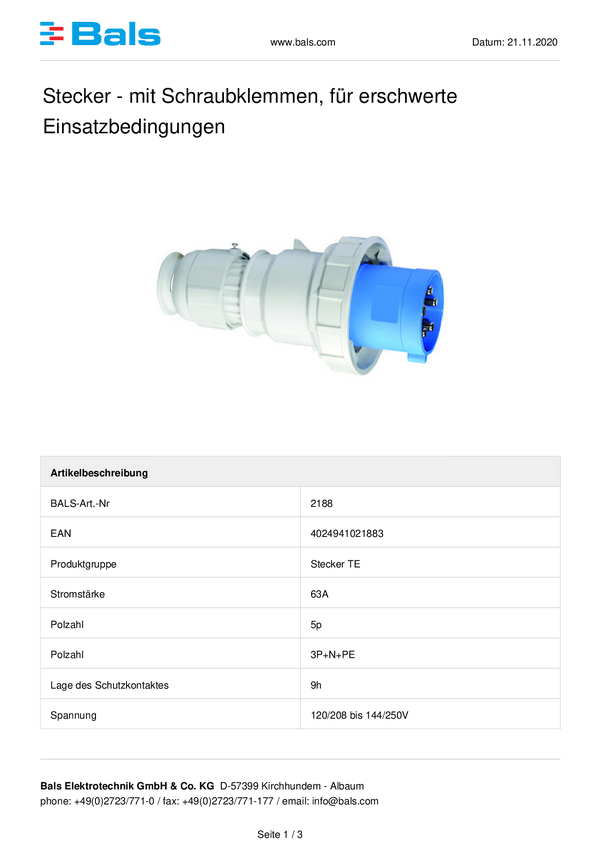 Złacze męskie CEE Bals Elektrotechnik 2188 63.0 A 230 V