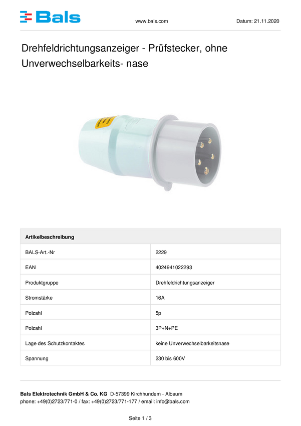 Złacze męskie CEE Bals Elektrotechnik 2229