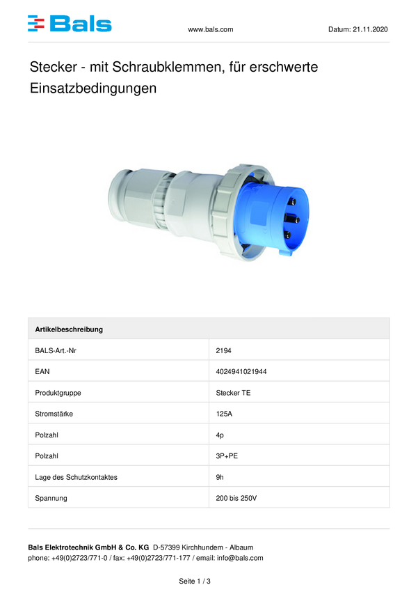 Złacze męskie CEE Bals Elektrotechnik 2194 125.0 A 230 V