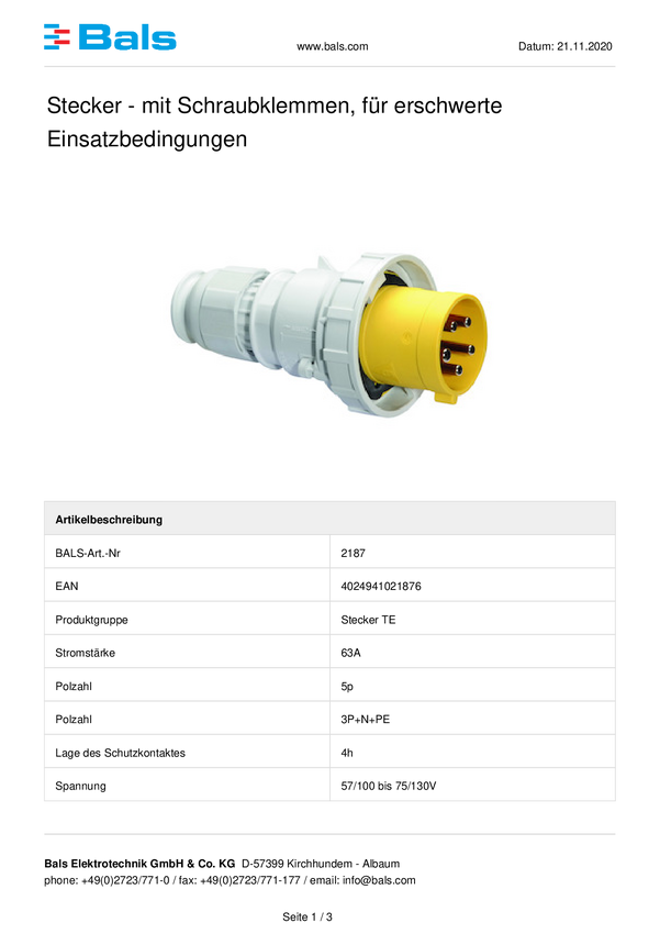 Złacze męskie CEE Bals Elektrotechnik 2187 63.0 A 110 V