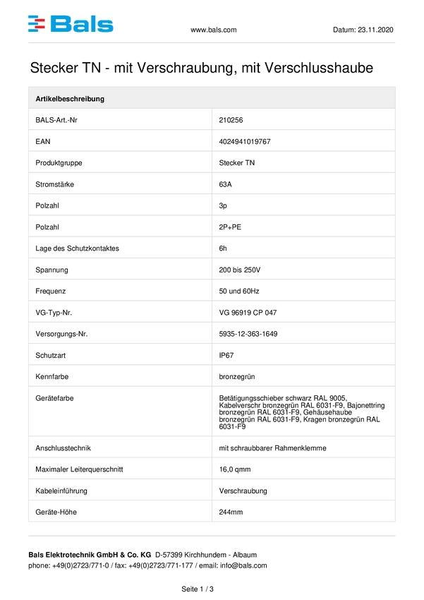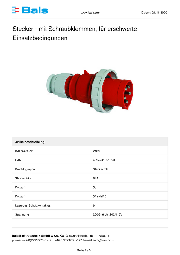 Złacze męskie CEE Bals Elektrotechnik 210256 63.0 A 230 V