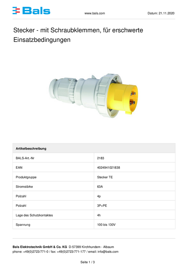 Złacze męskie CEE Bals Elektrotechnik 2183 63.0 A 110 V