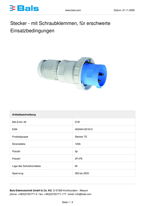 Złacze męskie CEE Bals Elektrotechnik 2191 125.0 A 230 V