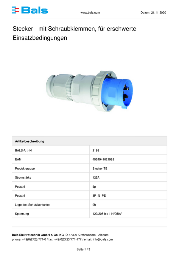 Złacze męskie CEE Bals Elektrotechnik 2198 125.0 A 230 V