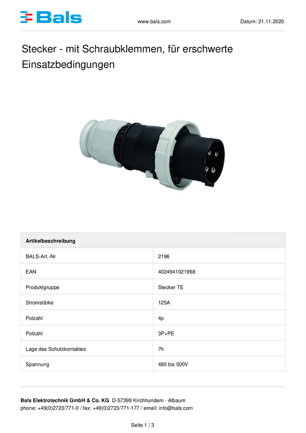 Złacze męskie CEE Bals Elektrotechnik 2196 125.0 A 500 V