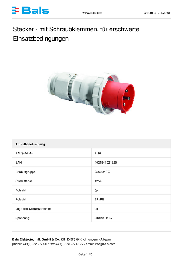 Złacze męskie CEE Bals Elektrotechnik 2192 125.0 A 400 V