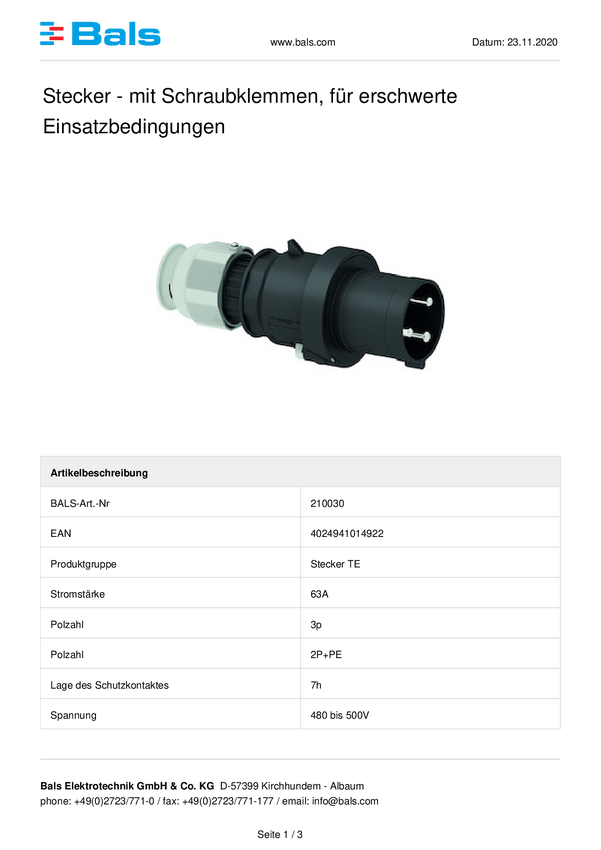 Złacze męskie CEE Bals Elektrotechnik 210030 63.0 A 500 V