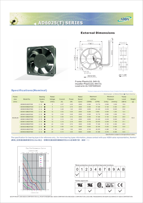 Wentylator 60 x 60 x15 mm; 5VDC; 0,355 m3/min; 24,8 dBA; łożysko kulkowe; ADDA;