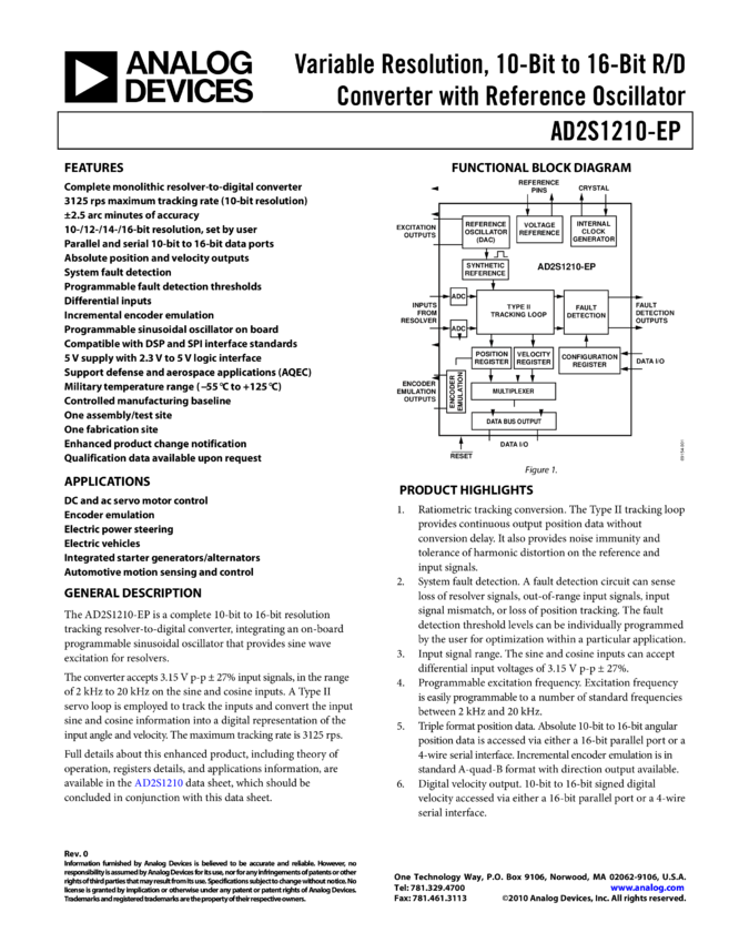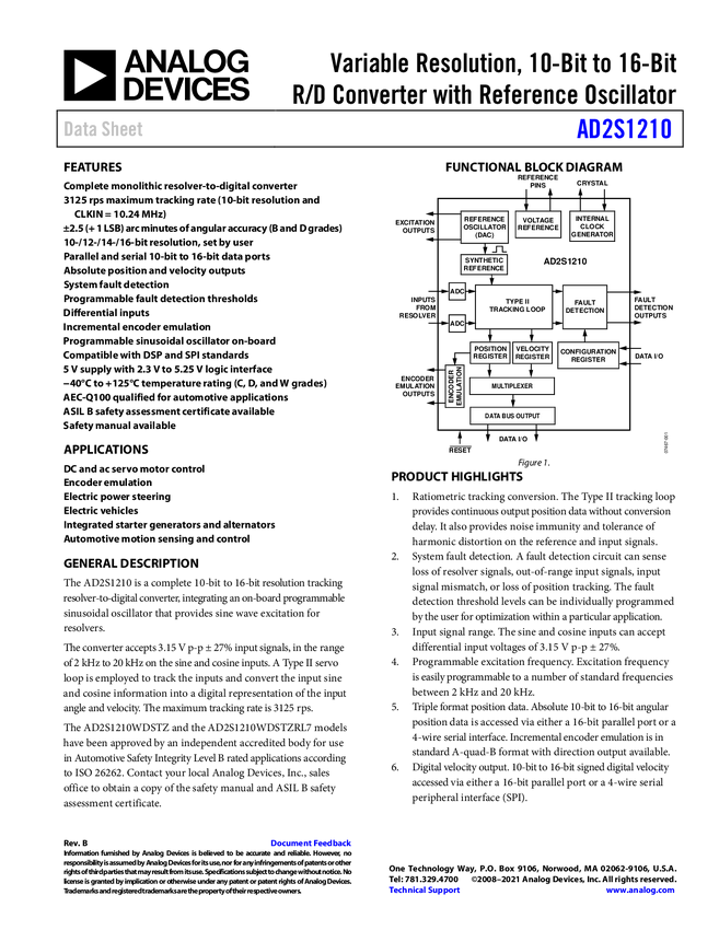 AD2S1210: Variable Resolution, 10-Bit to 16-Bit R/D Converter with Reference Oscillator