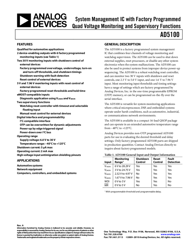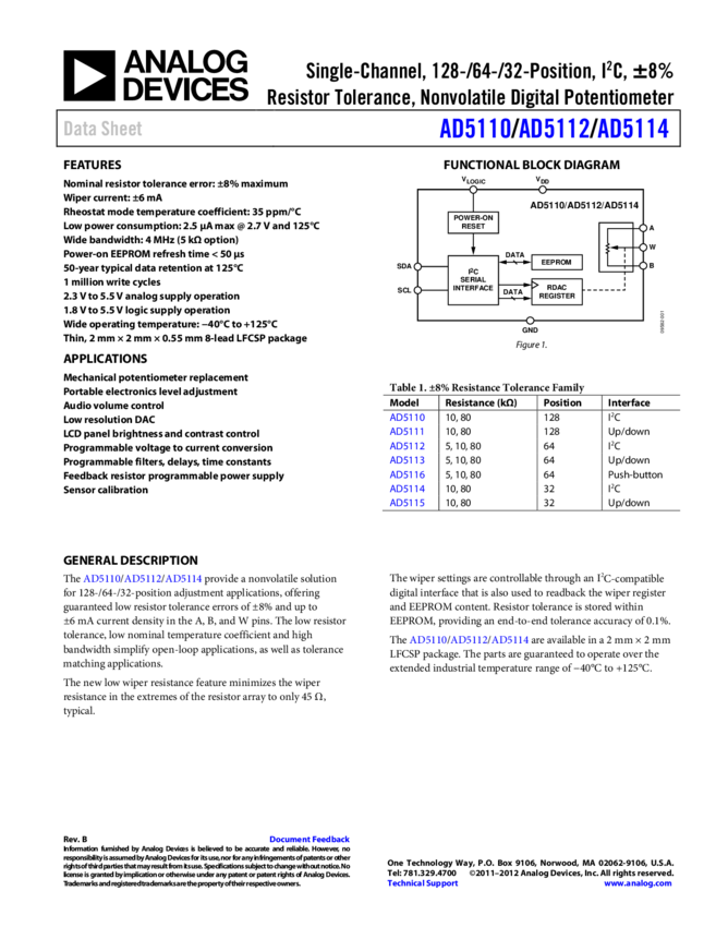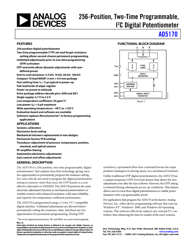 AD5170: 256-Position, Two-Time Programmable, IC Compatible Digital Potentiometer