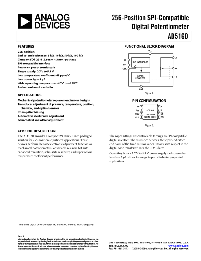 AD5160: 256 Position SPI Compatible Digital Potentiometer