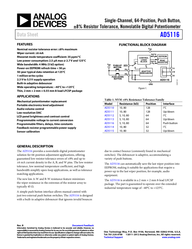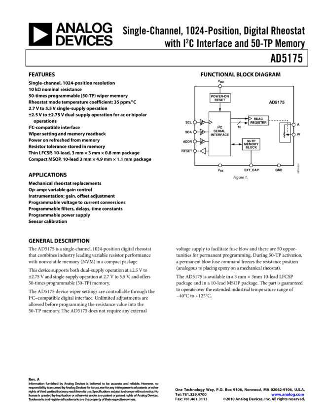 AD5175: Single-Channel, 1024-Position, Digital Rheostat with I²C Interface and 50-TP Memory