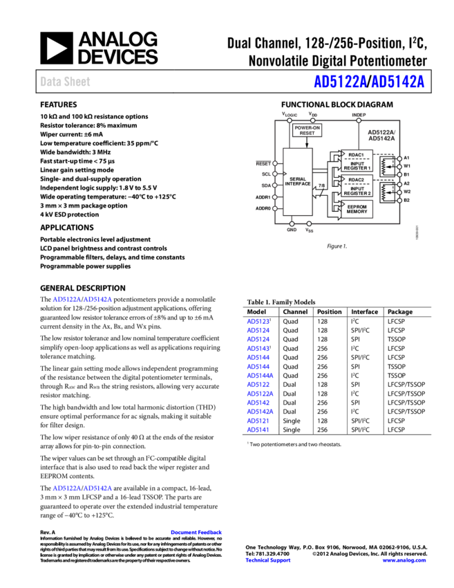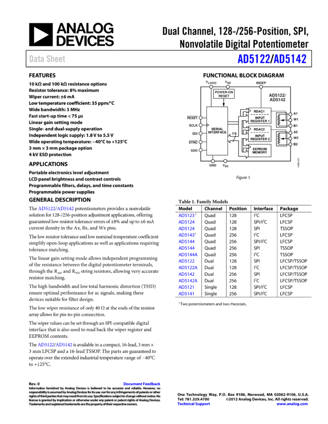AD5142: Dual Channel, 256-Position, SPI, Nonvolatile Digital Potentiometer