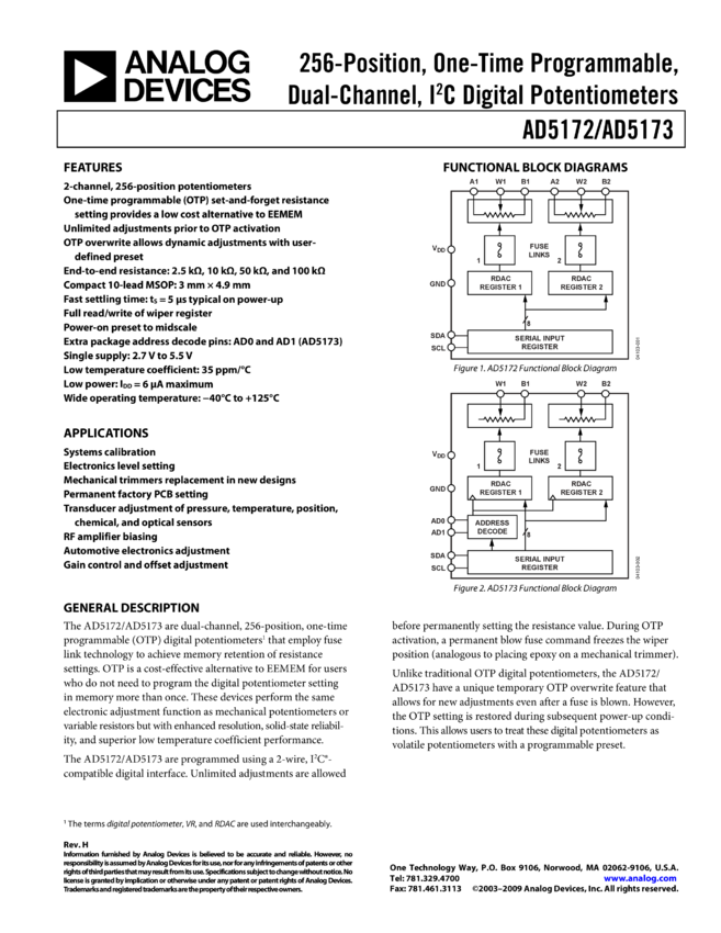 AD5173: 256-Position, One-Time Programmable, Dual Channel, IC Digital Potentiometer