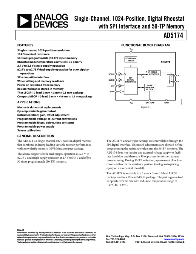 AD5174: Single-Channel, 1024-Position, Digital Rheostatwith SPI interface and 50-TP Memory