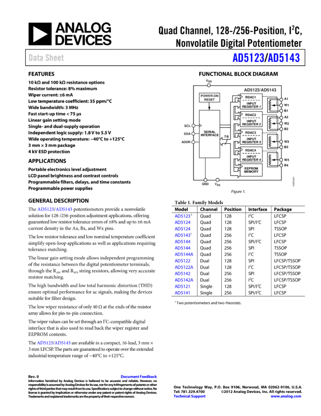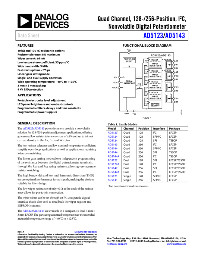 AD5143: Quad Channel, 256-Position, IC, Nonvolatile Digital Potentiometer