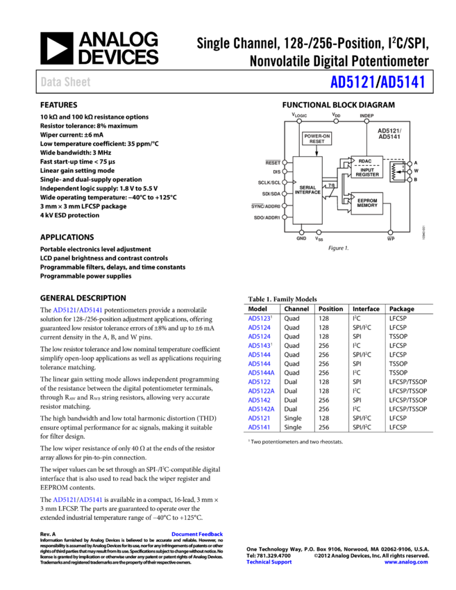 AD5141: Single Channel, 256-Position, IC / SPI, Nonvolatile Digital Potentiometer