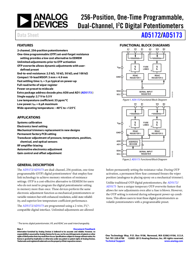 AD5173: 256-Position, One-Time Programmable, Dual Channel, IC Digital Potentiometer