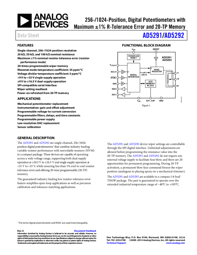AD5292: Single Channel, 1024-Position, 1% R-Tol, Digital Potentiometer with 20-Times Programmable Memory