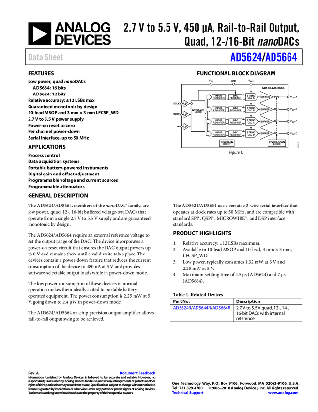 2.7 V to 5.5 V, 450 A, Rail-to-Rail Output, Quad, 16-Bit DAC