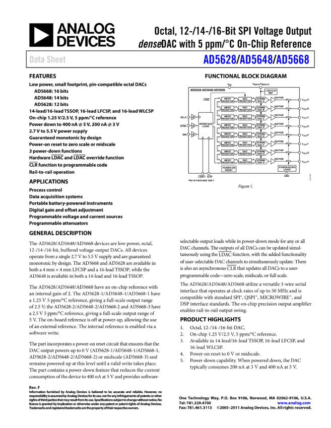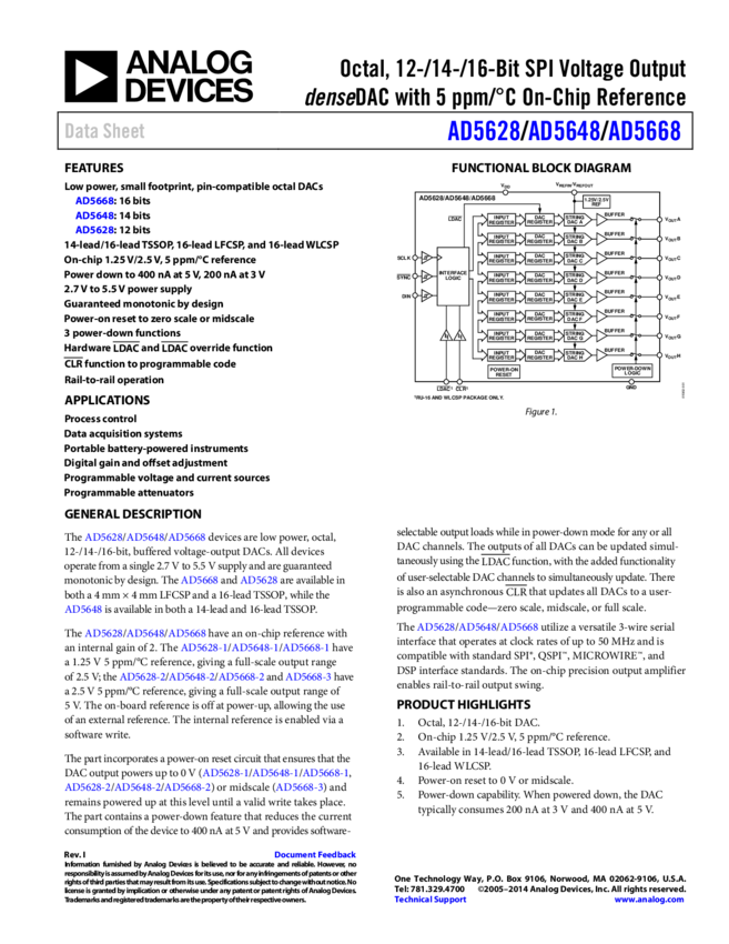 AD5668: Octal, 16-Bit, SPI Voltage Output DAC With 5 PPM/°C On-Chip Reference