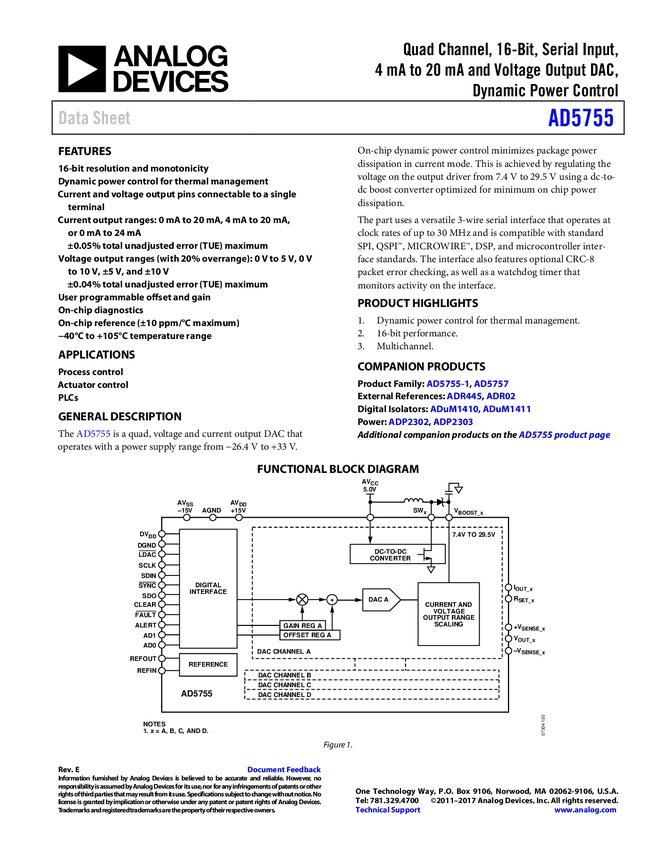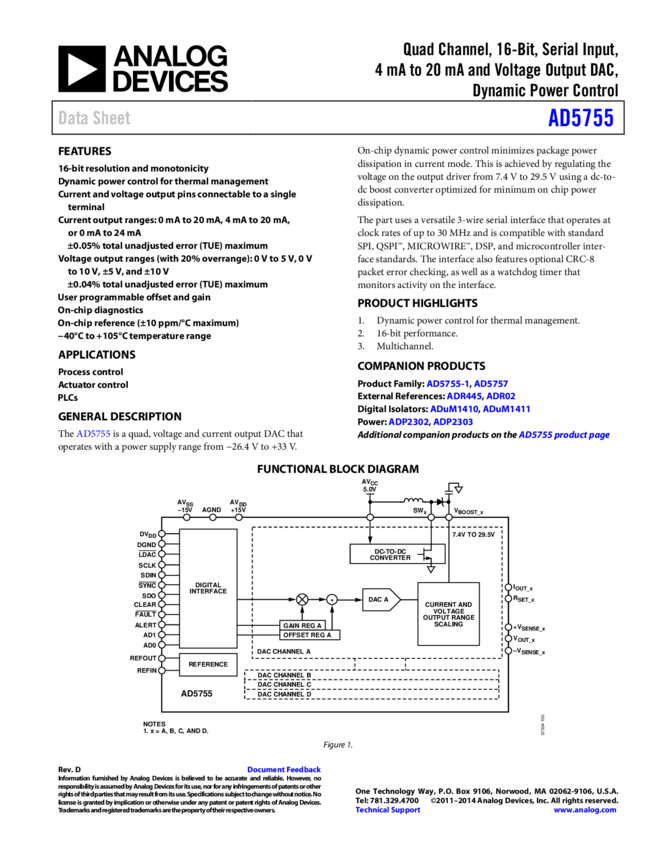 AD5755: Quad Channel, 16-Bit, Serial Input,4 mA to 20 mA and Voltage Output DAC, Dynamic Power Control