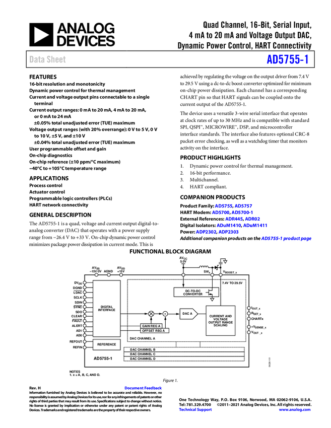 AD5755-1: Quad Channel, 16-Bit, Serial Input, 4-20mA & Voltage Output DAC, Dynamic Power Control, HART Connectivity